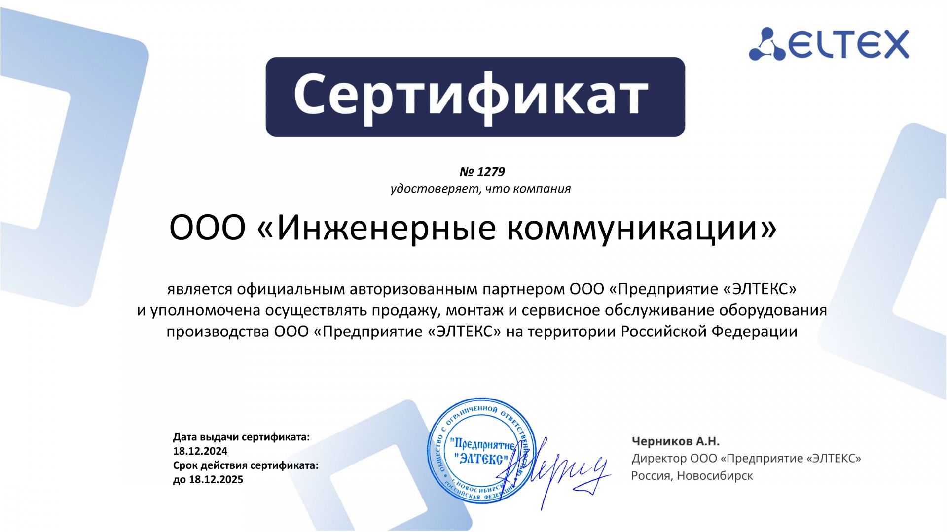 Удостоверяет, что наша компания является официальным партнером завода Eltex.