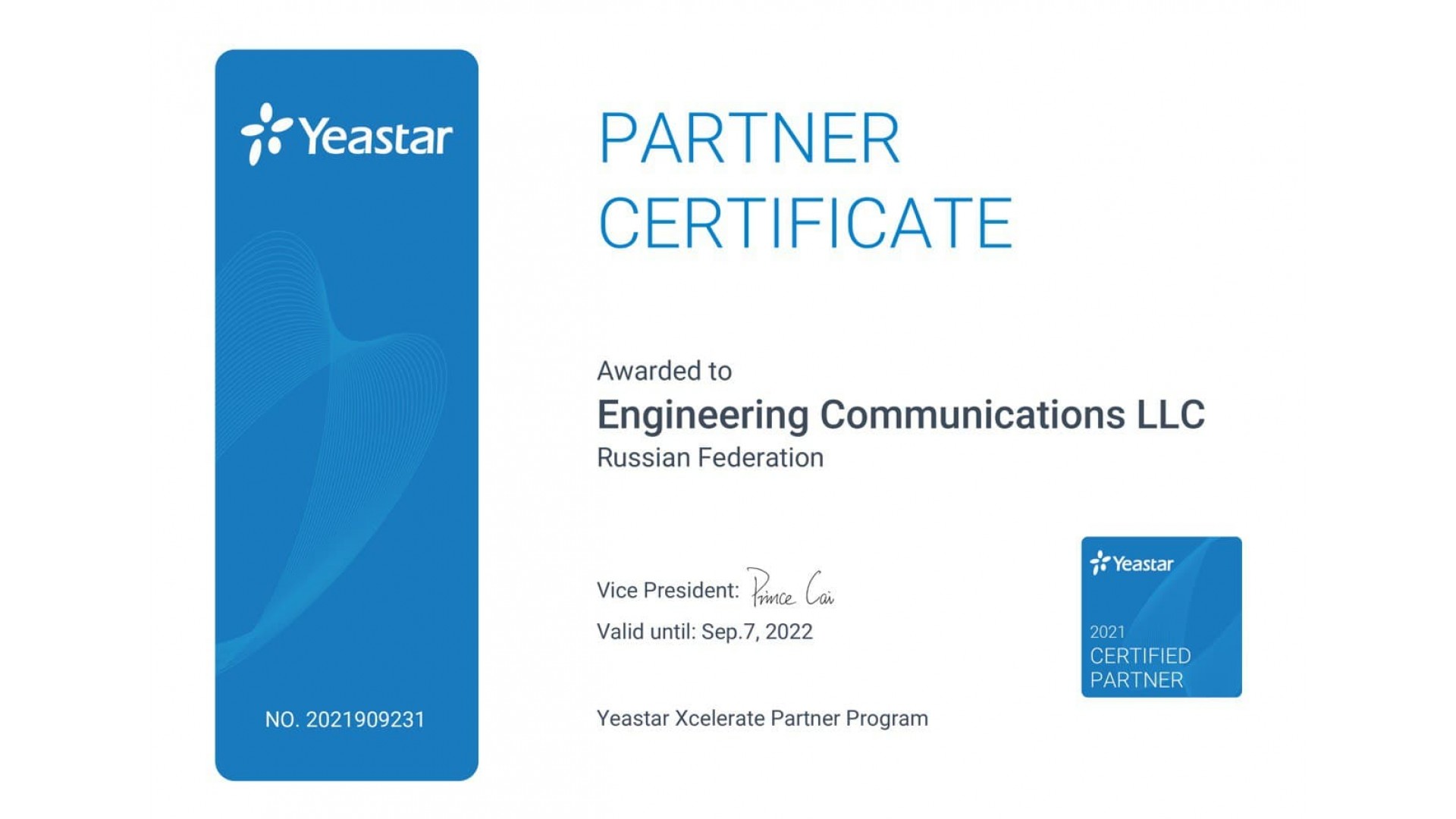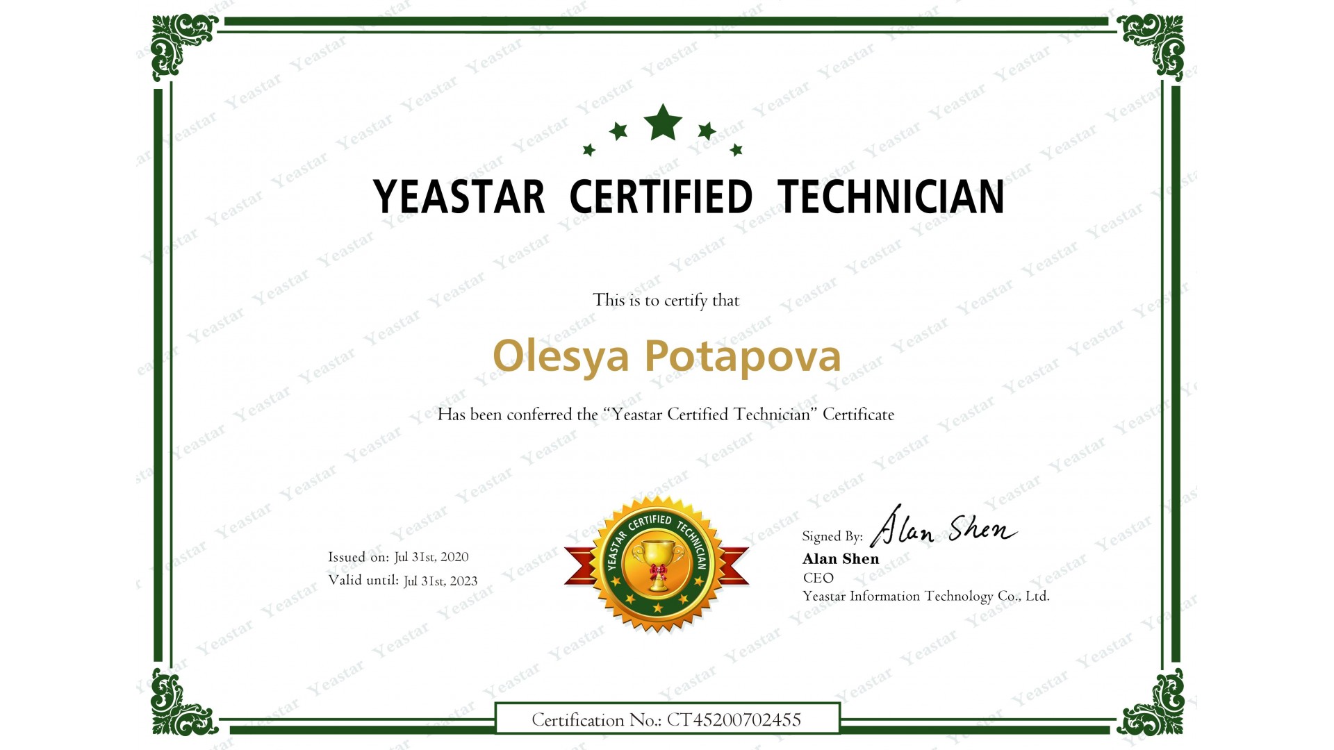 Сертификат Yeastar 'Certified Technician' выдан Олесе Потаповой.