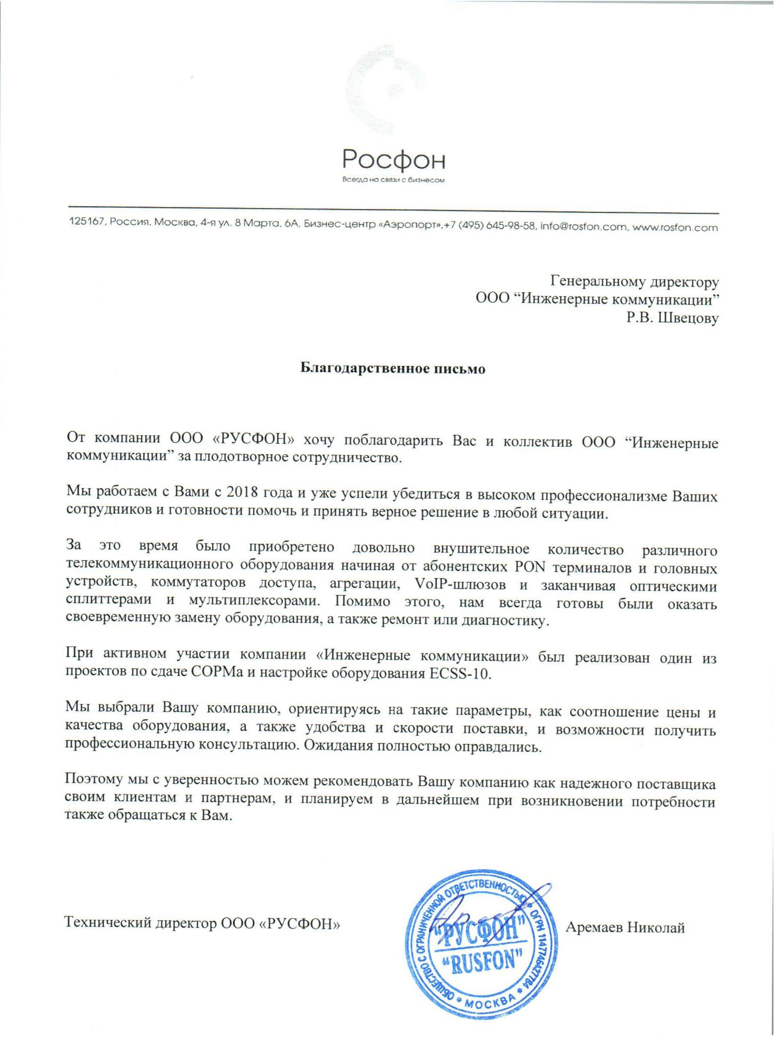 Мы получили благодарность за сотрудничество от компании Русфон