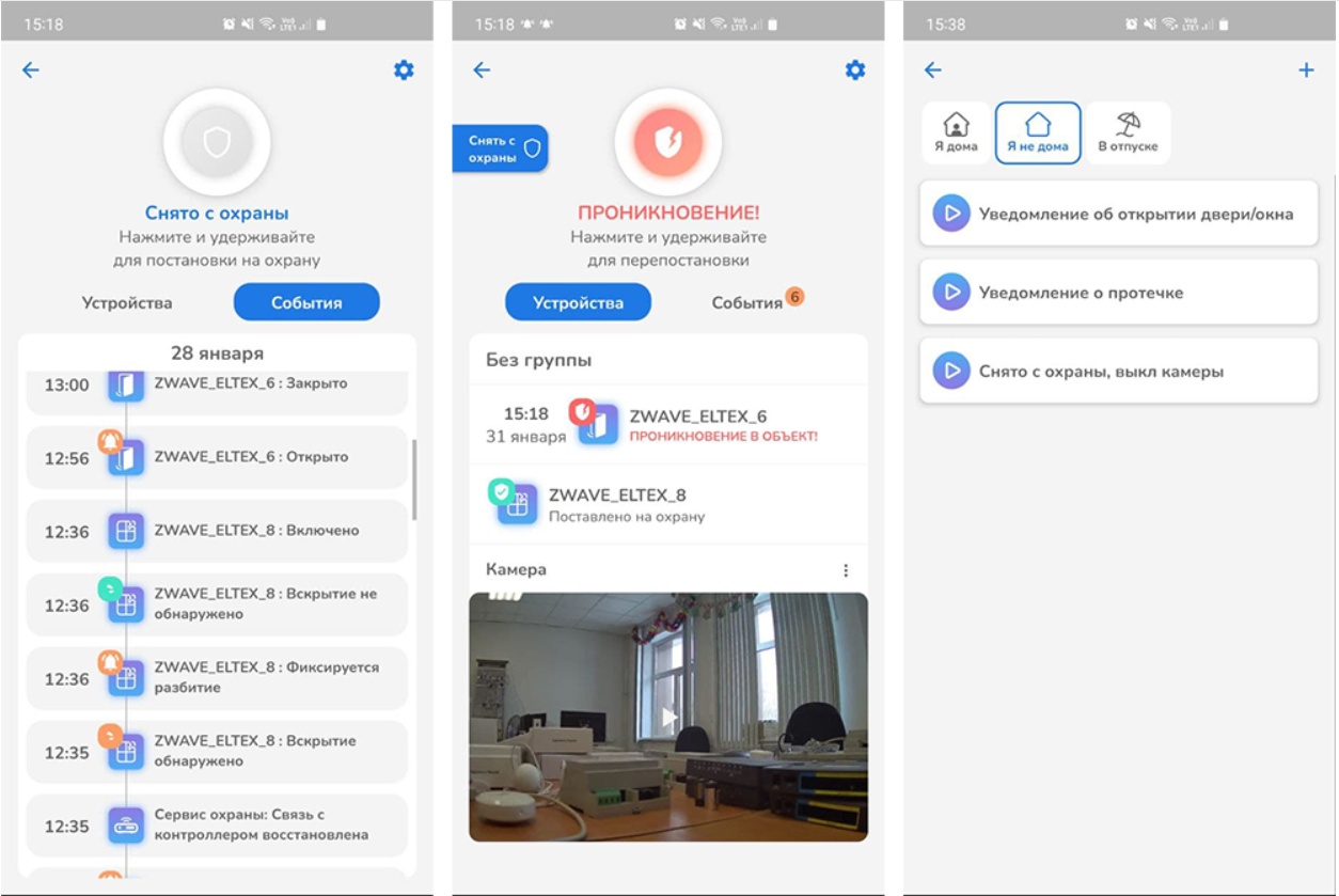 Все сервисы умного дома Eltex объединяются в пользовательские сценарии, которые гибко настраиваются под задачи пользователя. Например, можно настроить систему так, чтобы онлайн-камера начинала запись при срабатывании датчика открытия дверей во время отсутствия пользователя дома.