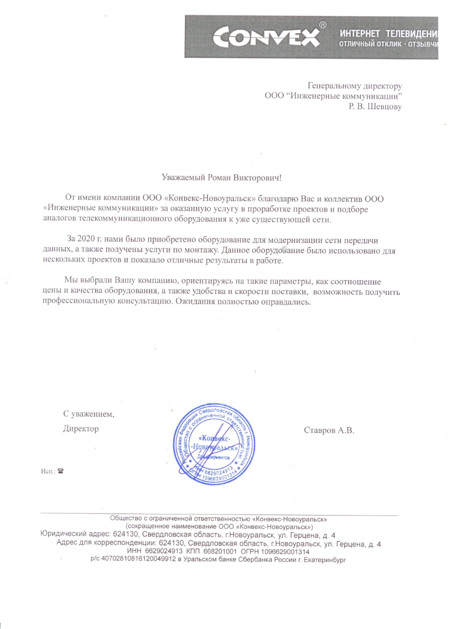 Мы получили положительный отзыв от компании ООО "Конвекс-Новоуральск". Для данного клиента мы подобрали аналоги оборудования к уже существующей телекоммуникационной сети, а также выполнили монтаж оборудования.