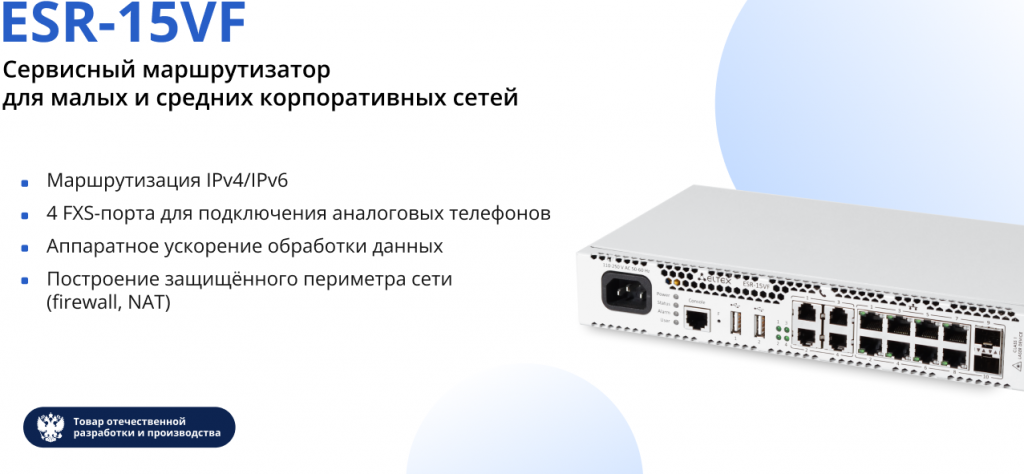 ESR-15VF – универсальное сетевое решение, которое объединяет возможности маршрутизатора и экрана, а также использует аппаратное ускорение для обработки трафика. Это обеспечивает высокую производительность корпоративной сети даже при больших нагрузках и упрощает её администрирование.