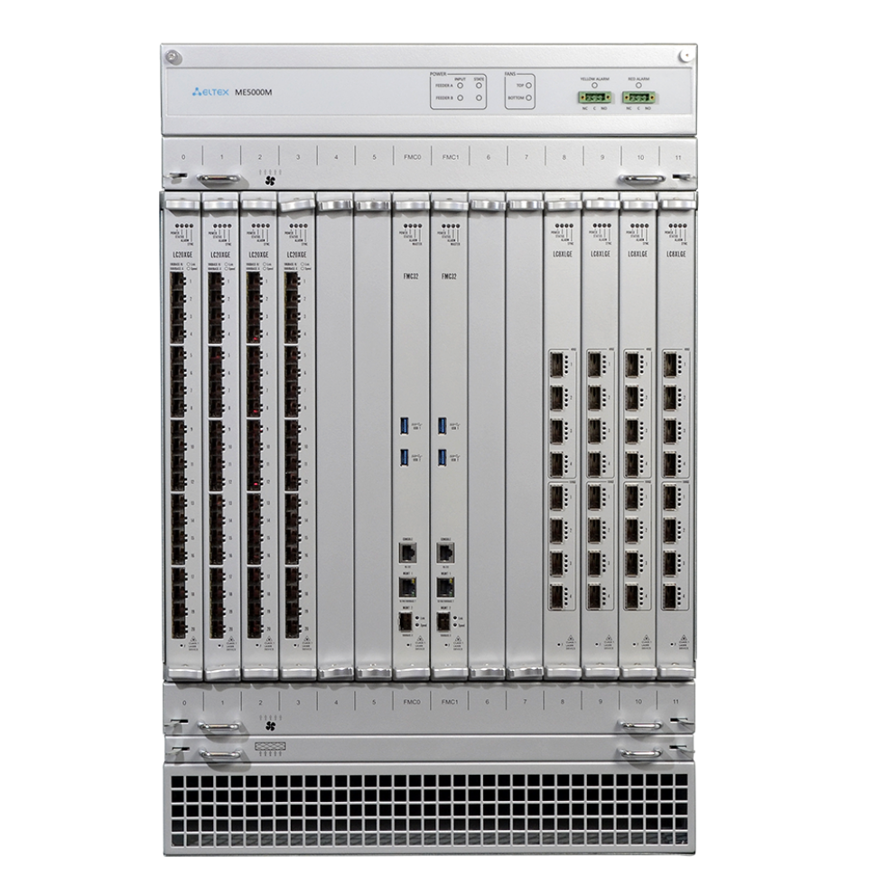 Модульная архитектура ME5000M обеспечивает гибкое масштабирование и возможность аппаратного конфигурирования под различные требования как по пропускной способности, так и по типам сетевых интерфейсов. Модули маршрутизатора устанавливаются в шасси — стандартный 19" евроконструктив 15U. В шасси предусмотрены два слота для установки модулей управления и коммутации FMC и 12 слотов для установки линейных модулей LC.