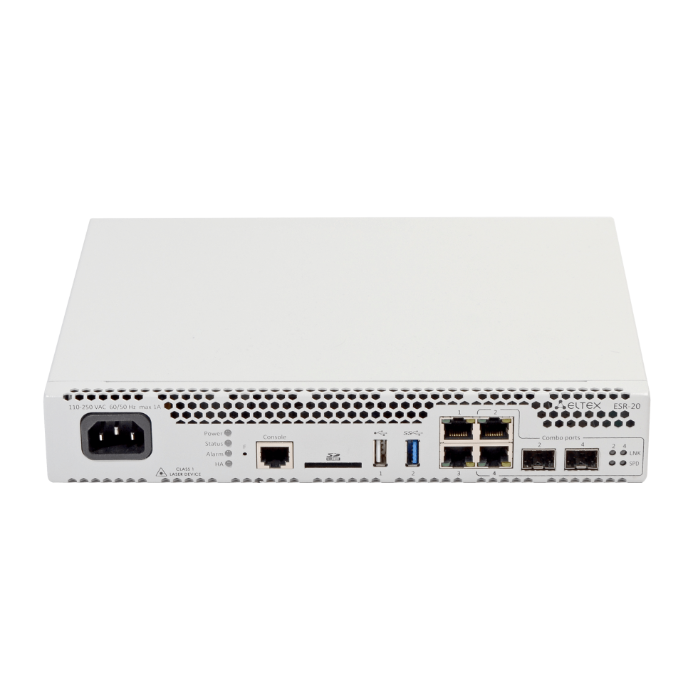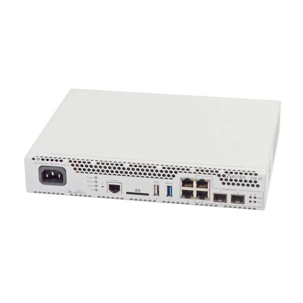 Функциональное назначение ESR-20 – универсальный сервисный маршрутизатор, разработанный с учетом требований предприятий энергетической и нефтегазовой отраслей. Устройства поддерживают расширенные функции L3, VPN и Firewall.