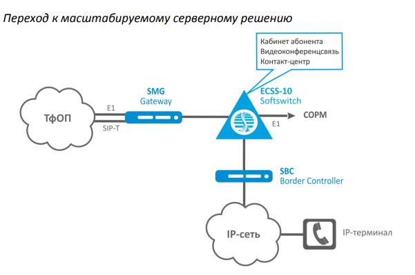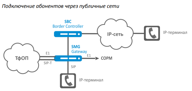 Предусмотрена возможность прямого подключения SMG к телефонной сети общего пользования (ТфОП) через потоки Е1 и VoIP-транки (SIP, SIP-T/SIP-I, H.323 и H.248). Поддержка требований Приказов № 70 и 268 по СОРМ позволяет обеспечить интерфейс для взаимодействия с пультом СОРМ ФСБ России. Функционал управления вызовами через RADIUS обеспечивает гибкую маршрутизацию вызовов.