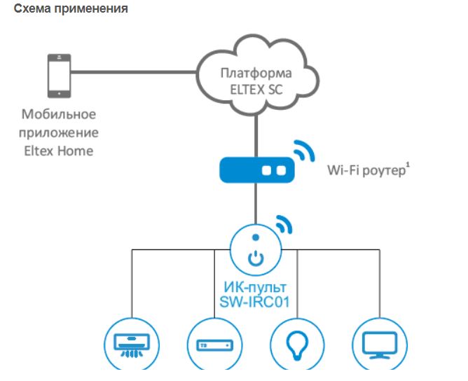SW-IRC01 — часть экосистемы умного дома Eltex, основанной на облачной платформе Eltex SC (Eltex Smart Cloud). Пользователь управляет умными устройствами через хаб умного дома и датчиками с помощью мобильного устройства на базе iOS или Android с установленным приложением Eltex Home.