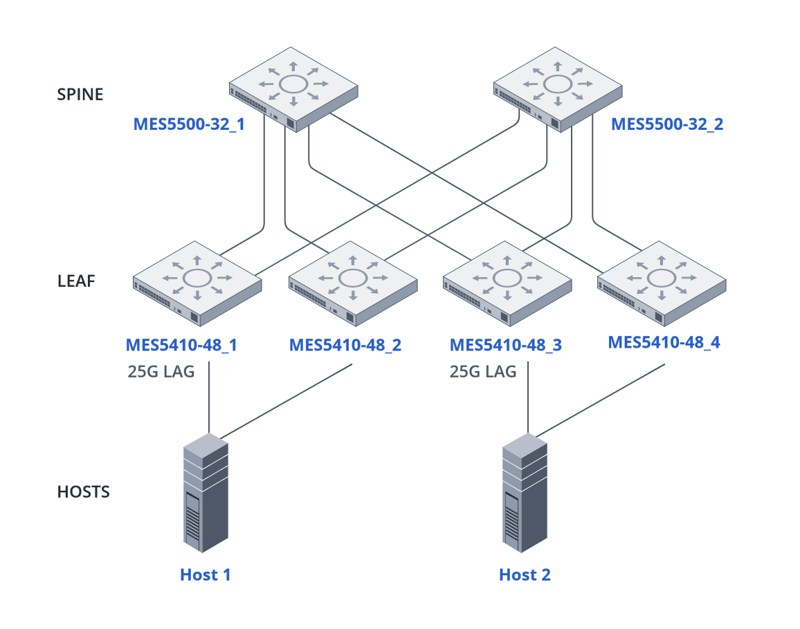 Критически важно, чтобы такие устройства были мощными, надёжными и способными справляться с большим объёмом данных без задержек. В решении на уровне Spine мы используем самые производительные модели – MES5410-48 и MES5500-32.