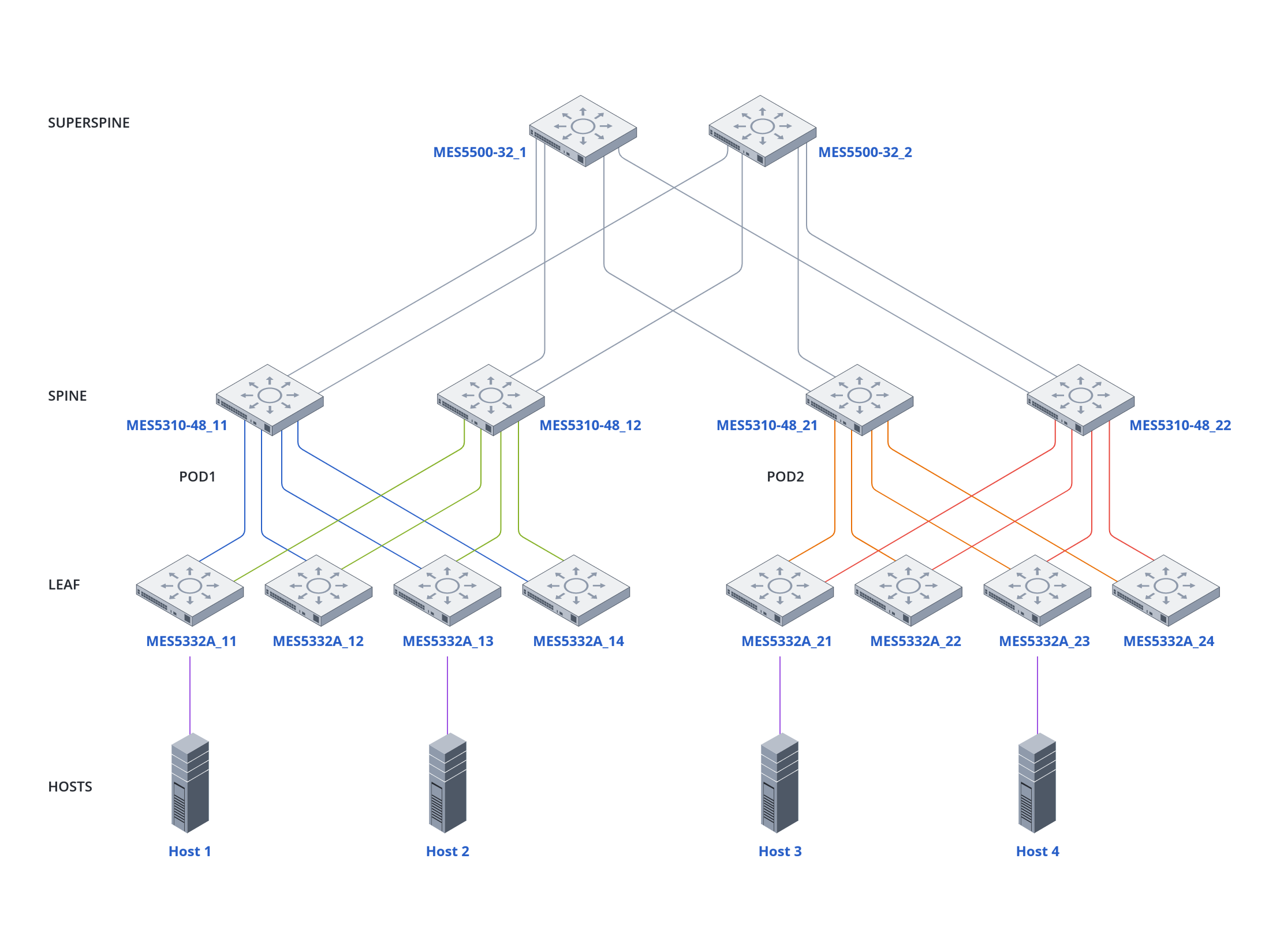 Если требуется высокоскоростное магистральное соединение между несколькими IP-фабриками, например, распределёнными по разным площадкам, вводится дополнительный уровень в топологию сети – Superspine. Коммутатор этого уровня, применяемый в решении, – MES5500-32. Также ведётся разработка коммутаторов с портами 400 Гбит/c.