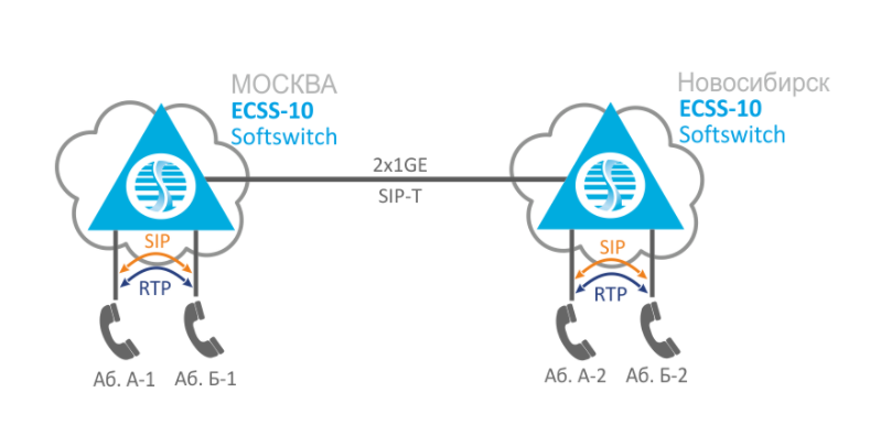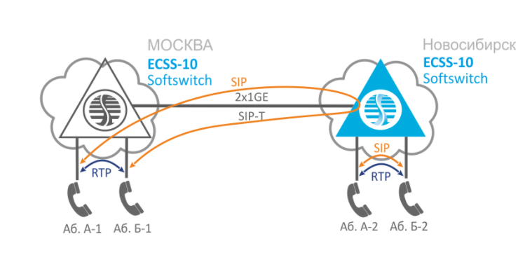Структурная схема распределённой VoIP-сети с географическим резервированием представлена на рисунке 1. Узлы связи реализованы на базе ECSS-10 Softswitch и располагаются в разных географических локациях: Москва и Новосибирск. Данные узлы объединены двумя гигабитными линками по протоколу SIP-T. В штатном режиме вся внутренняя нагрузка одного региона обслуживается локально системами ECSS-10 Softswitch, системы в других регионах используются только при совершении вызовов между данными регионами.