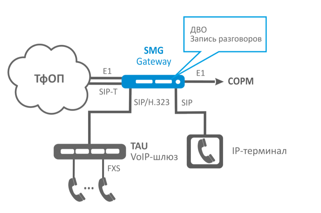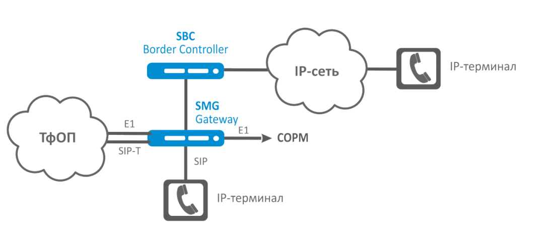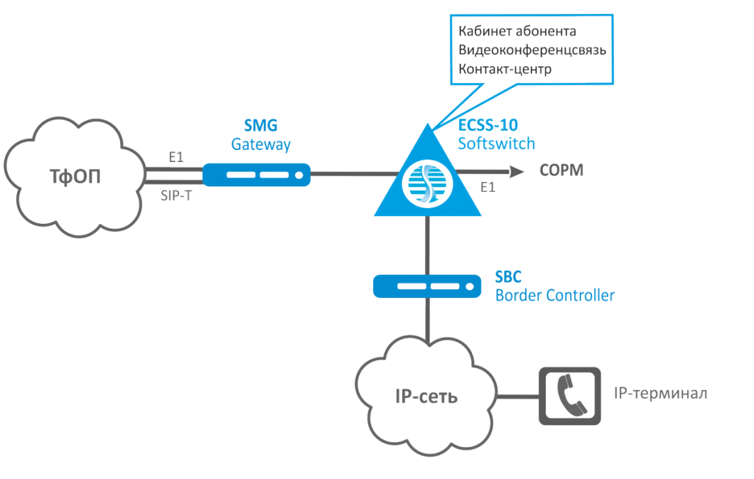 На первом этапе Вы можете запустить недорогое решение IP-АТС на базе транковых шлюзов SMG в исполнении 1U. IP-АТС SMG обеспечивают регистрацию до 3000 абонентов с поддержкой широкого спектра дополнительных сервисов: удержание вызова (Call Hold), передача вызова (Call Transfer), переадресация (Call Forward), музыка на удержании (Music on Hold), группа вызовов (Call Hunt), перехват вызова (Call Pickup), интерактивные голосовые меню (IVR), запись разговоров (Call Recording) и индикатор занятости линии (BLF). Предусмотрена возможность прямого подключения SMG к телефонной сети общего пользования (ТфОП) через потоки Е1 и VoIP-транки (SIP, SIP-T/SIP-I, H.323 и H.248). Поддержка требований Приказов № 70 и 268 по СОРМ позволяет обеспечить интерфейс для взаимодействия с пультом СОРМ ФСБ России. Функционал управления вызовами через RADIUS обеспечивает гибкую маршрутизацию вызовов.