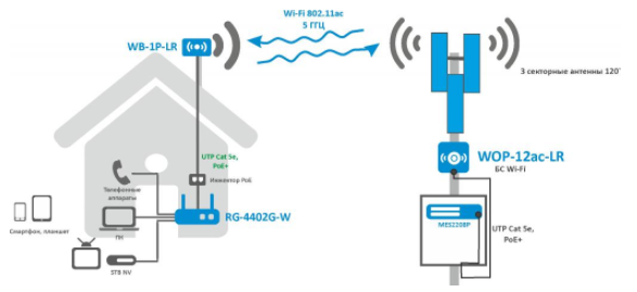 Абонентское оборудование встроено в корпус малогабаритной направленной антенны и устанавливается на крыше дома абонента или на мачте. WB-2P-LR обеспечивает подключение абонентов к сети БШПД по технологии Wi-Fi. К устройству через гигабитный Ethernet-порт можно подключить персональный компьютер или роутер, с помощью которого организовать домашнюю сеть.
